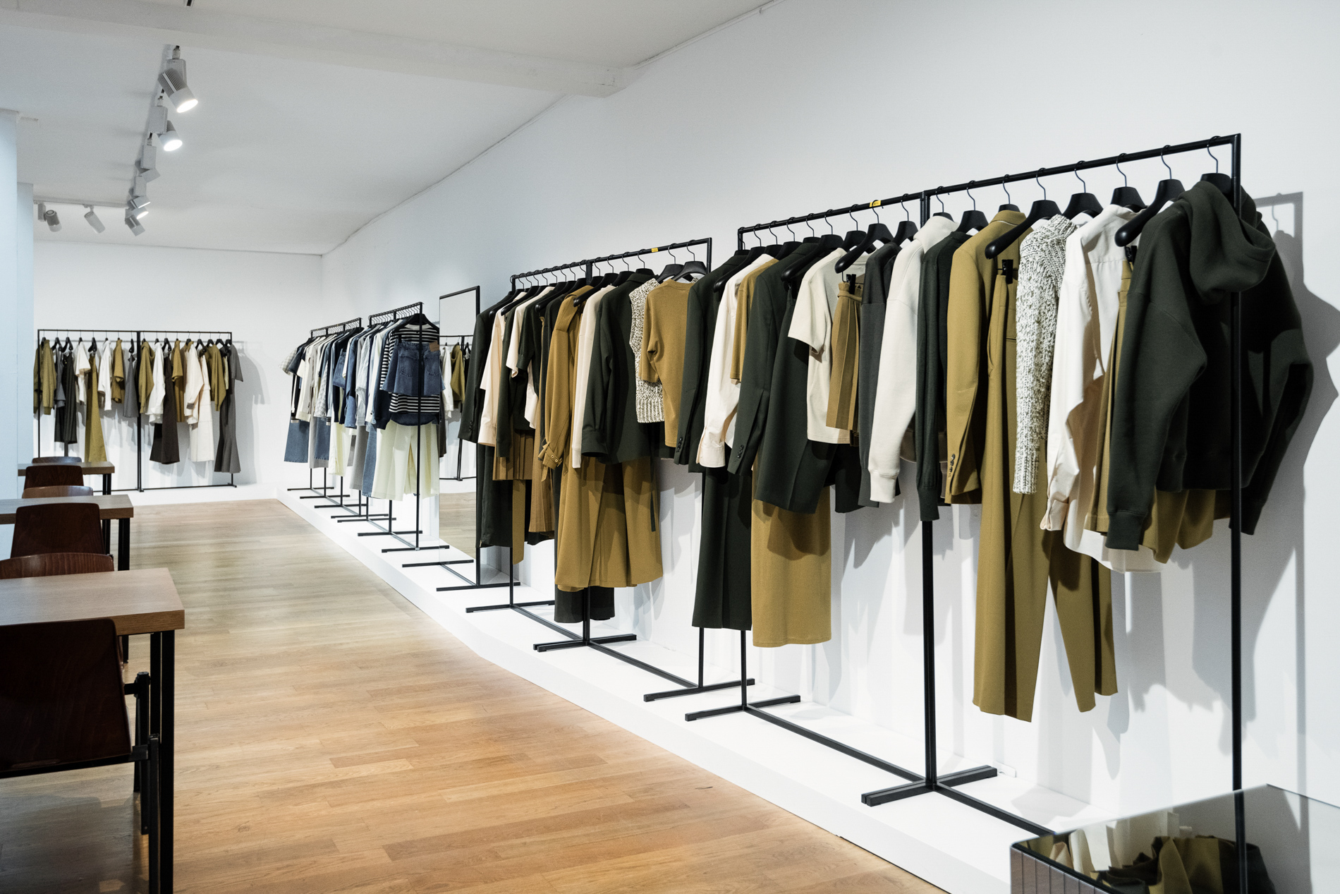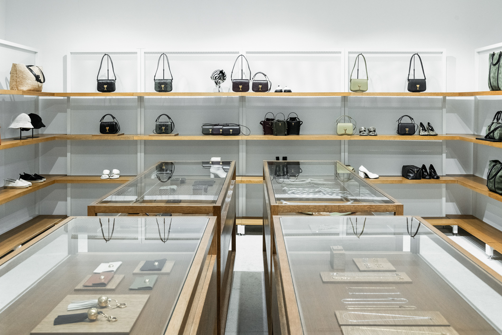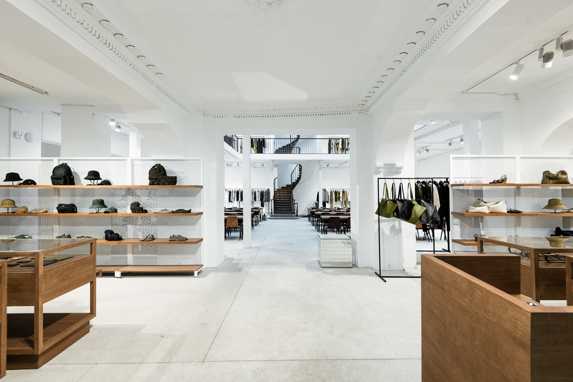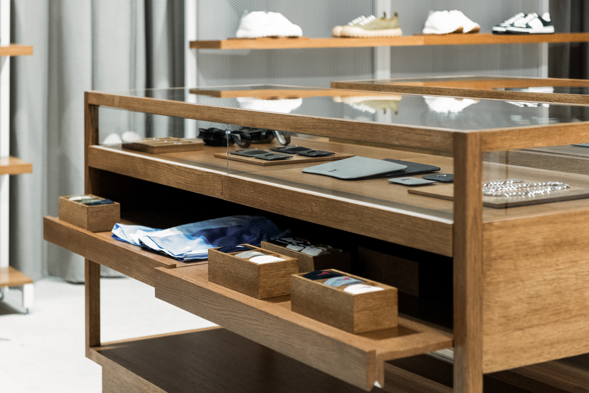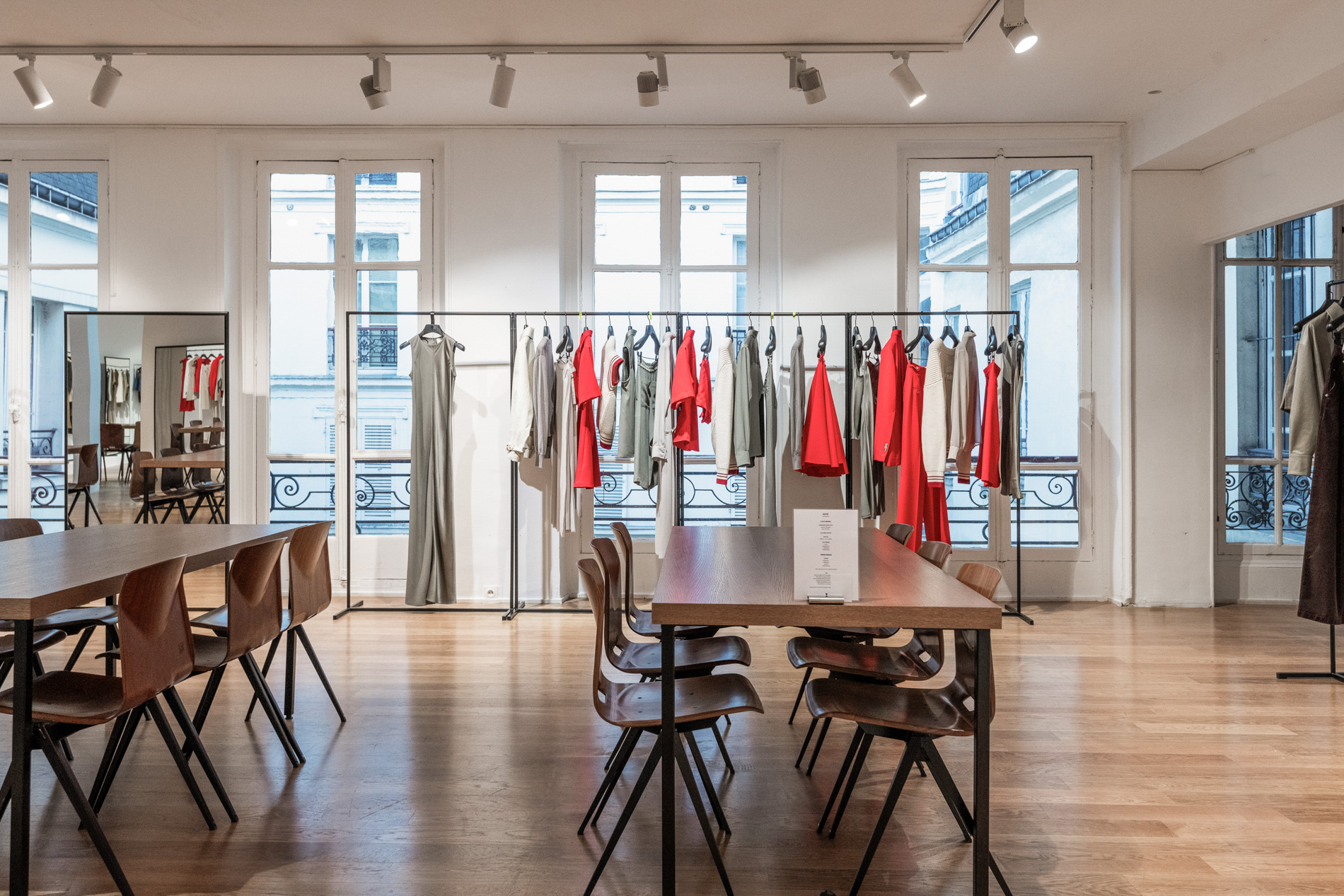 Le showroom SS25 AMI PARIS présentait du mobilier sur mesure reflétant l'esthétique des boutiques de la marque, accompagné d'une monumentale installation en tissu drapé inspirée de la scénographie du défilé.