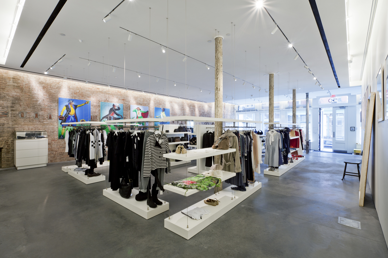 Création d’un lieu hybride, flexible et innovant. Une partie du lieu est consacrée à l’art et constitue une partie intrinsèque de la boutique. L’autre partie présente les collections femme, l’homme, les sacs et accessoires. Une collection de t-shirts d’artistes a été imaginée spécialement pour l’ouverture par les artistes Rostarr, Young Kim, Ryan McGinness, Harmony Korine, Ryan McGinley, José Parlá, BÄST, David Ellis, Louise Bourgeois et Jonas Mekas.