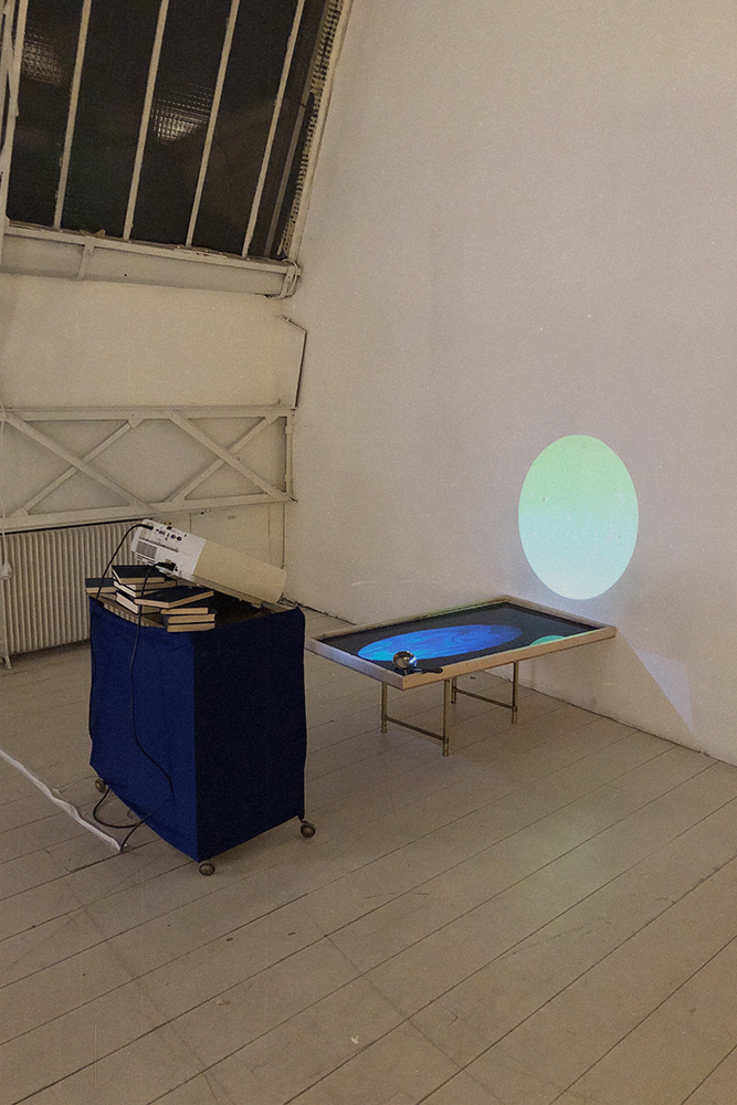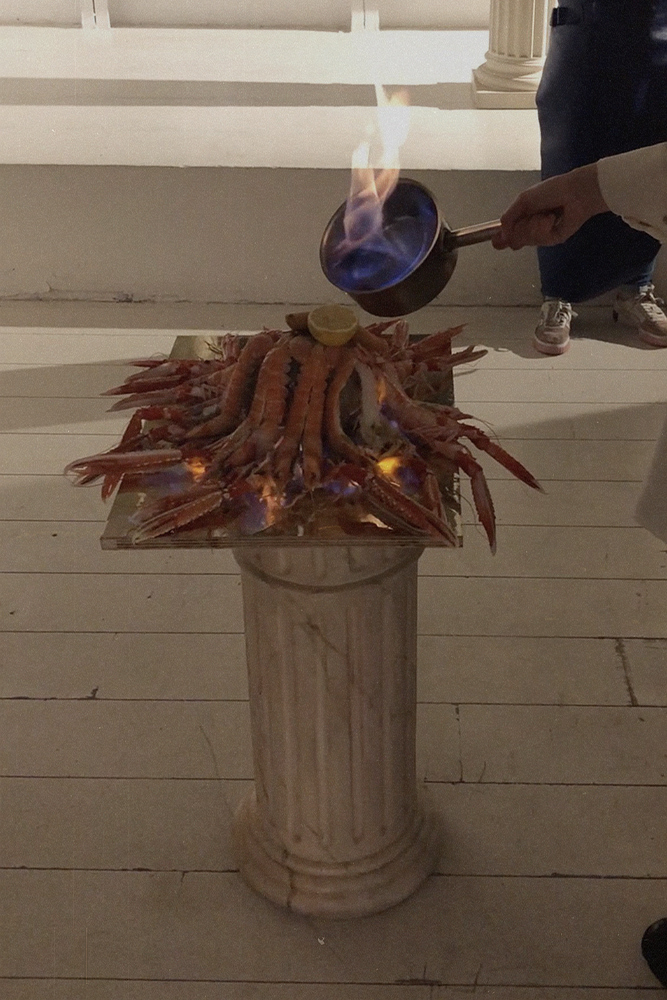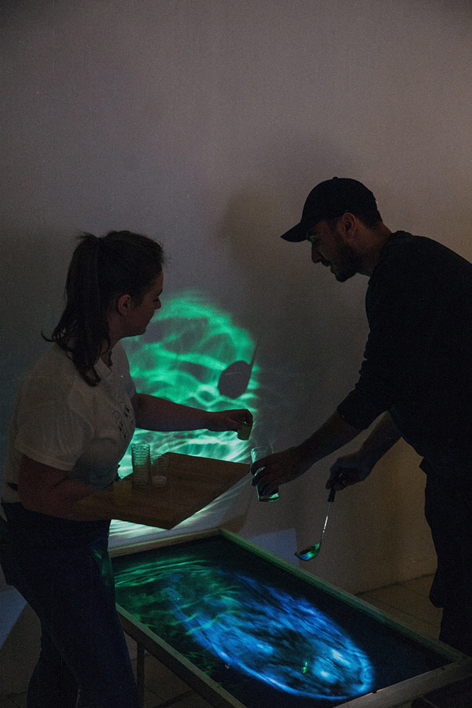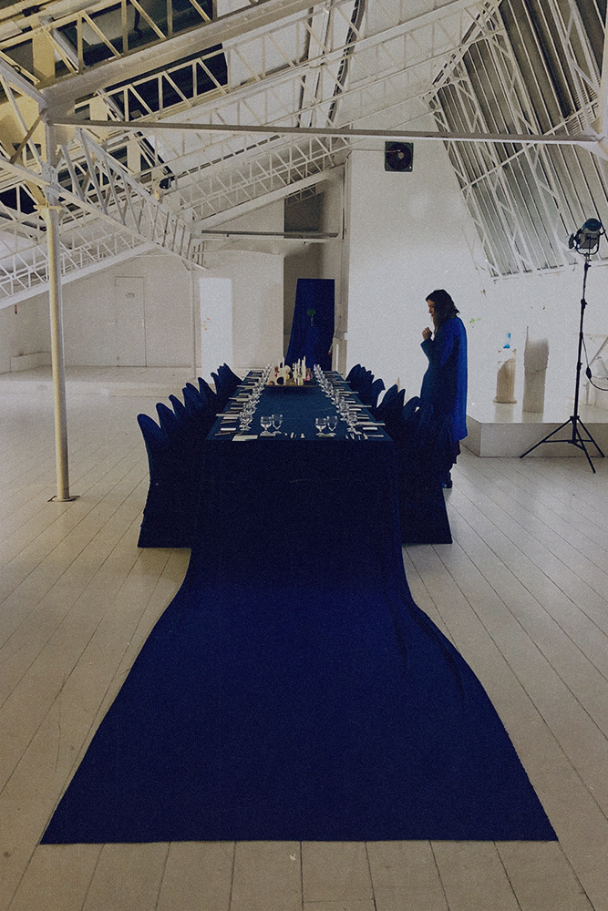 Création d’un parcours immersif énigmatique et mystérieux à la lumière bleue. En suivant cette lumière, on découvre une installation d’un immense drapé de mer bleue volante. Intervention scénographique sur le dîner expérientiel et surréaliste de la designer culinaire Céline Pelcé.