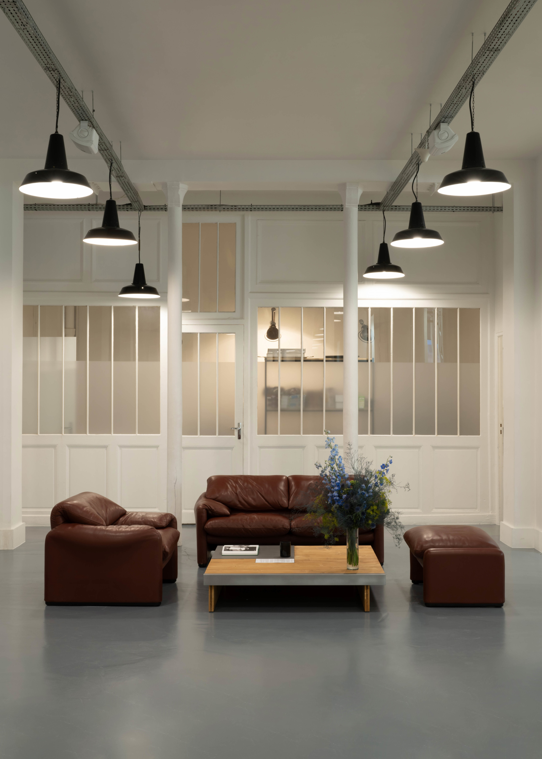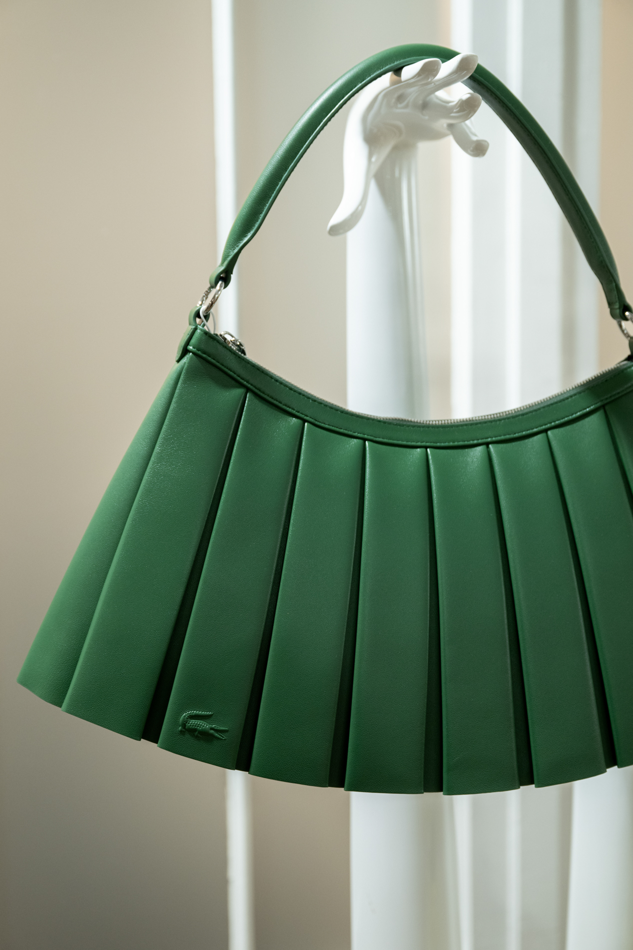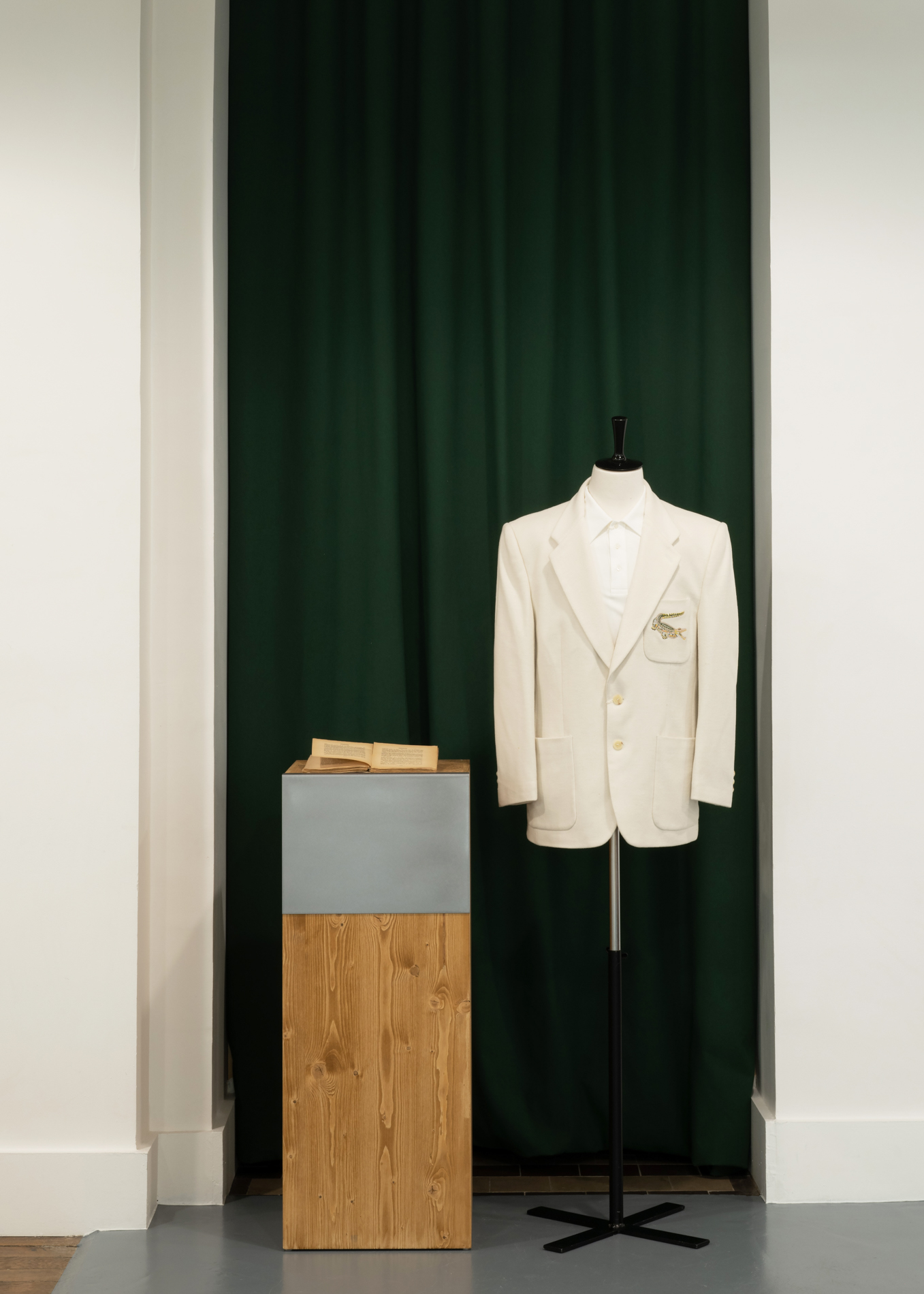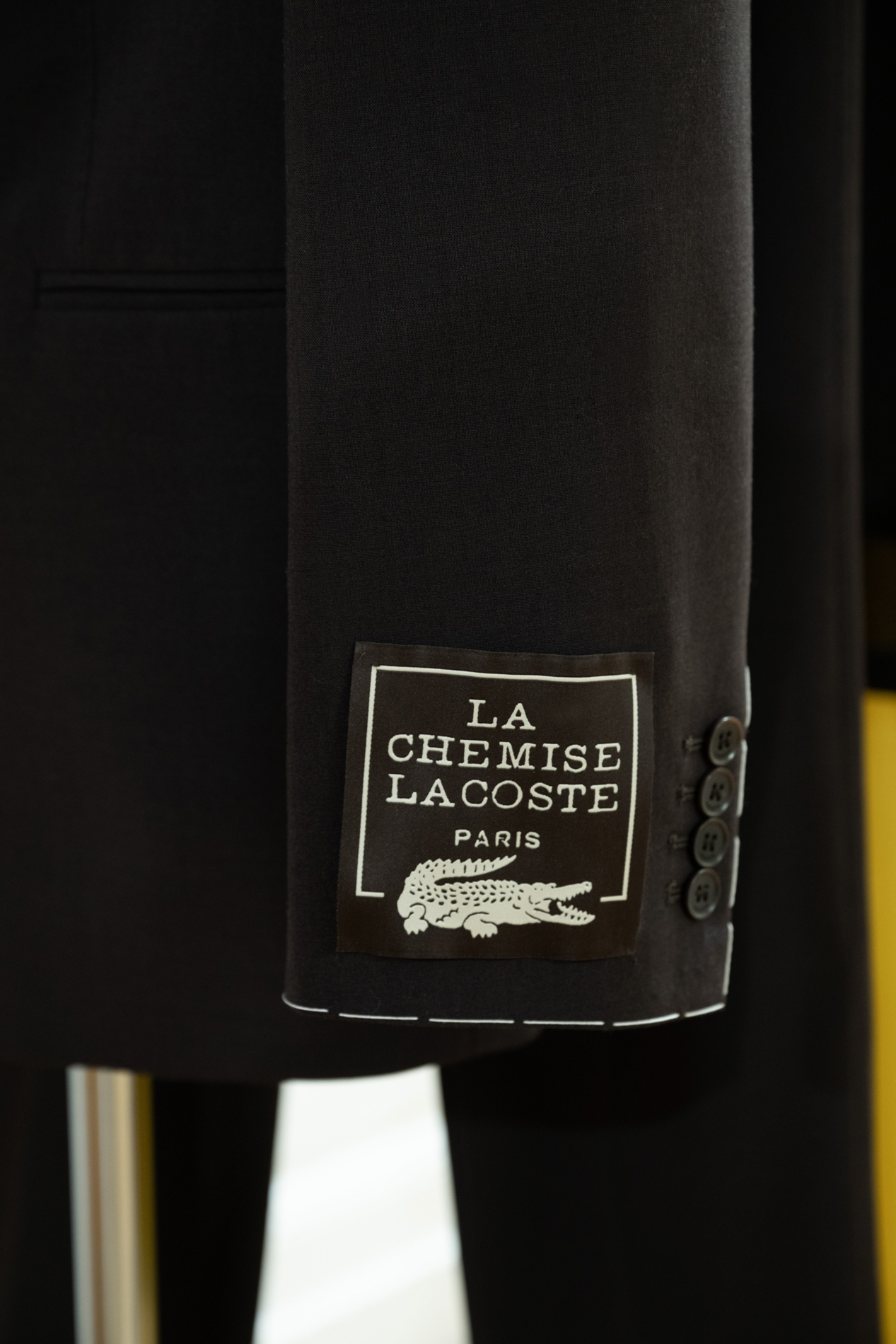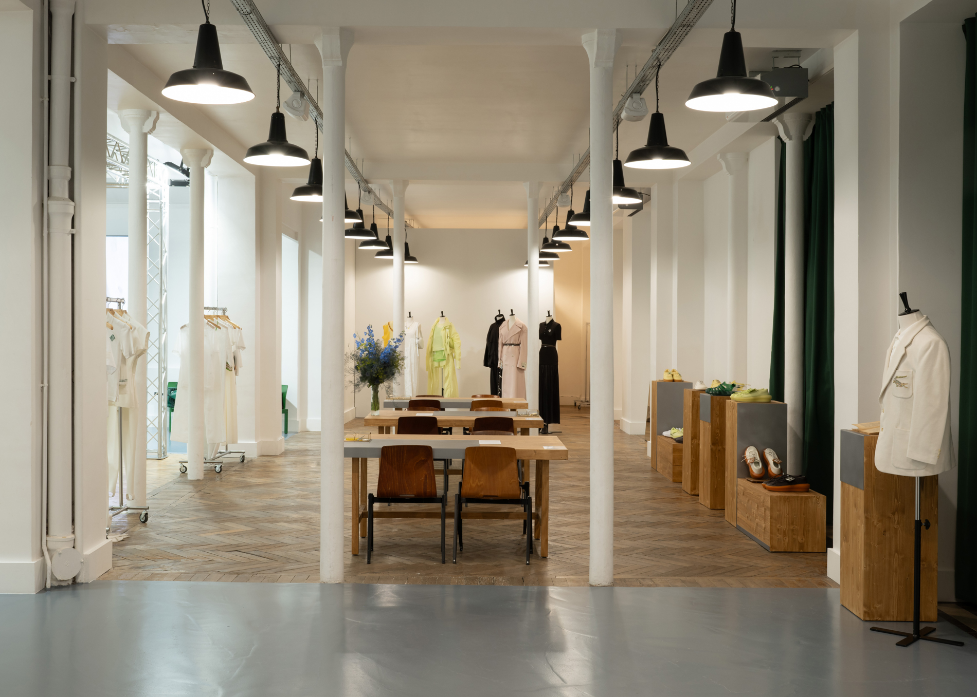 Le showroom Lacoste "Tennis to the Seaside", se distingue par une ambiance chaleureuse et conviviale, mêlant harmonieusement culture, sport, identité et héritage de la maison. Des meubles sur mesure en bois brut et en acier rappellent l’atmosphère d’un atelier dans une maison de campagne. Au centre de l’espace, une impressionnante sculpture d’un filets de tennis, créée par l’artiste britannique Susie MacMurray, fait écho à la scénographie du défilé.