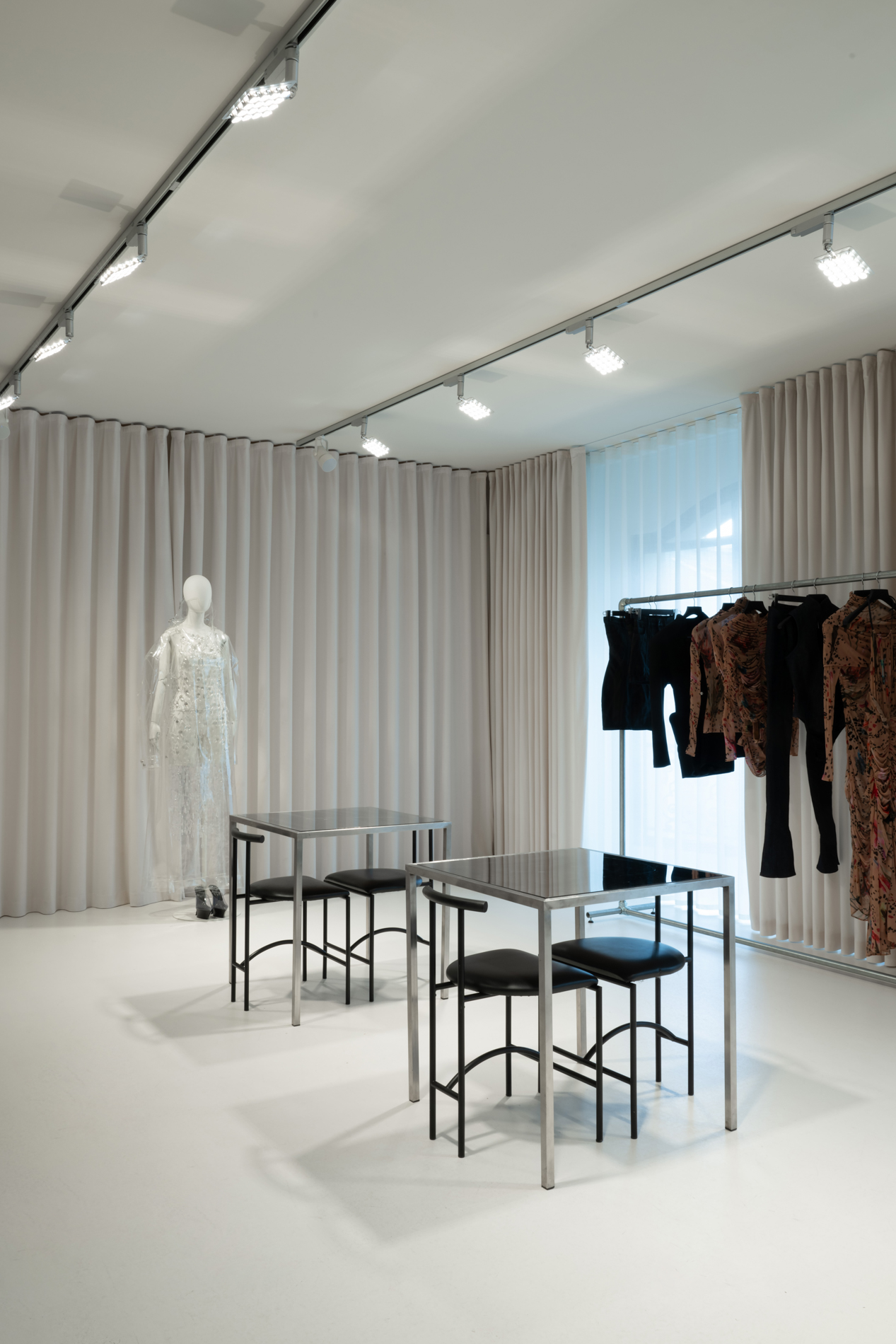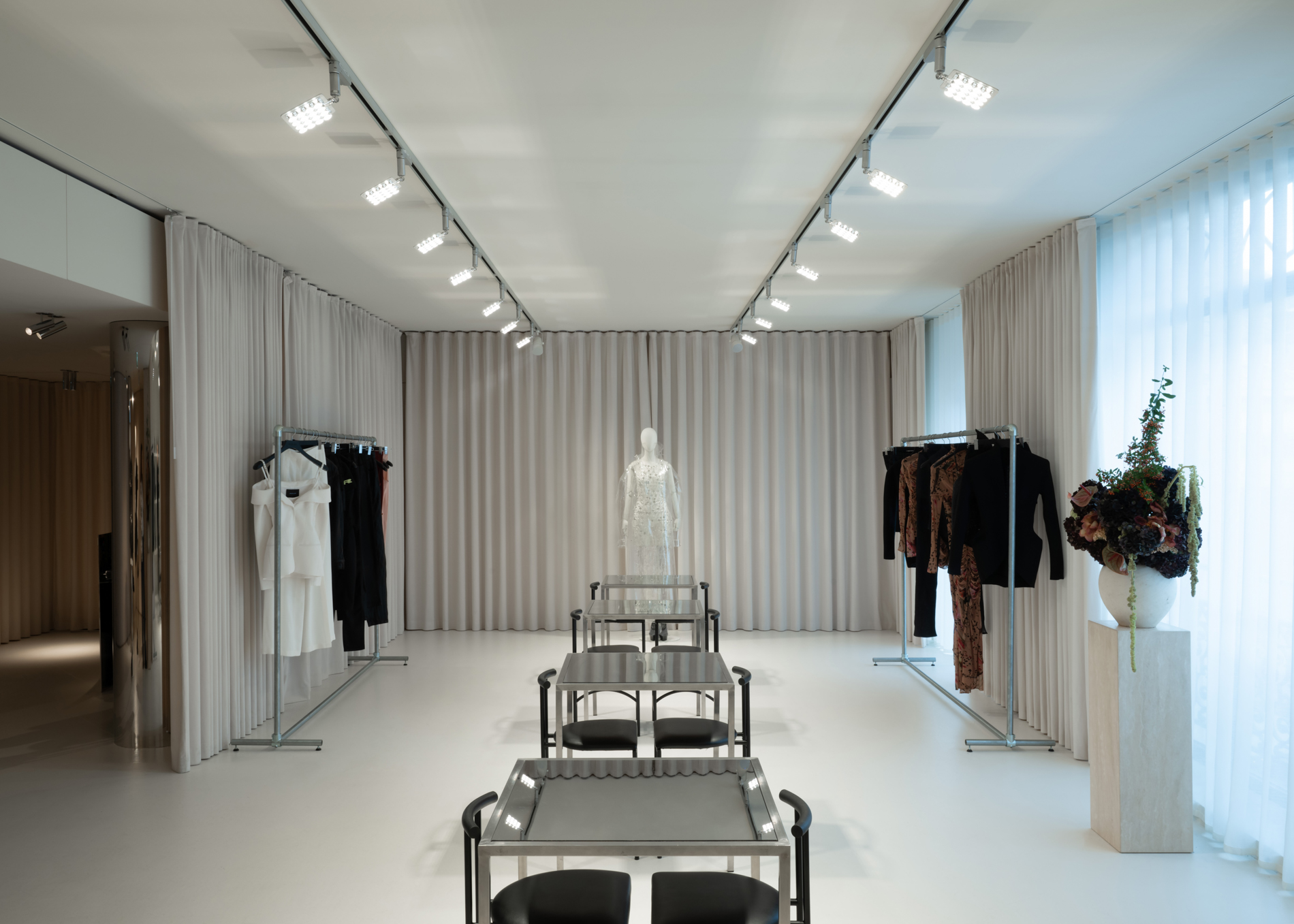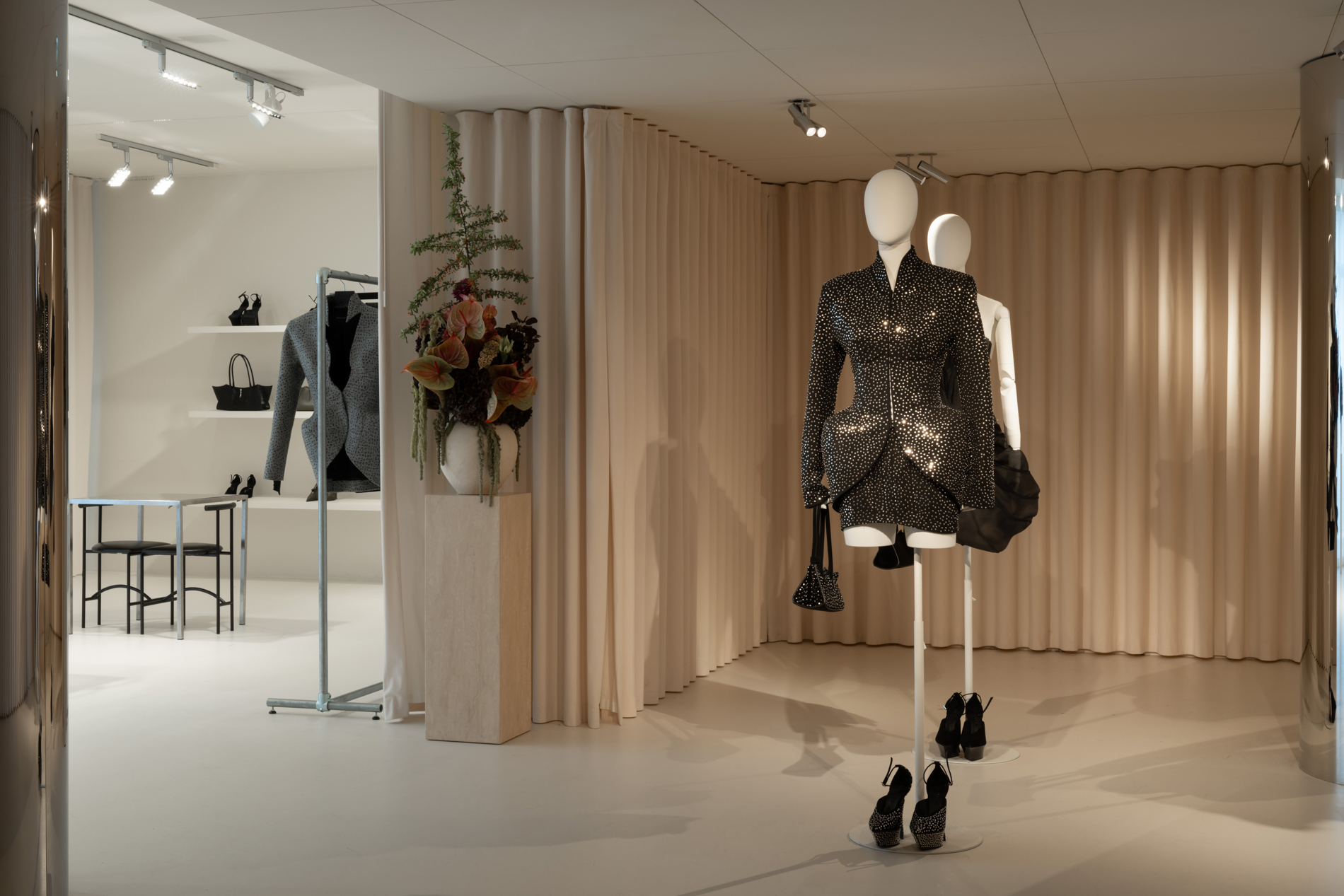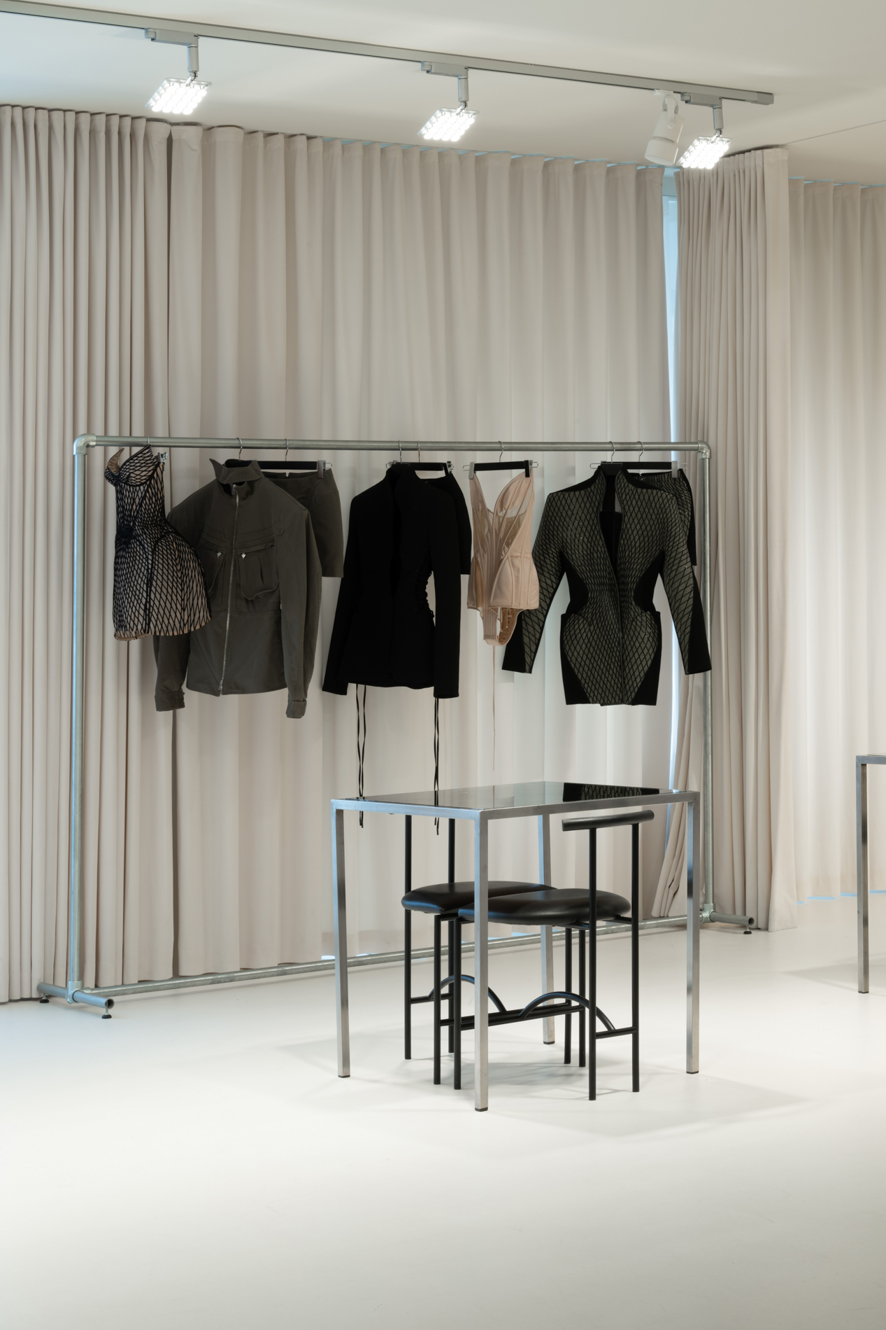Mugler dévoile un showroom chic, minimaliste et élégant, mettant parfaitement en valeur leur dernière collection.