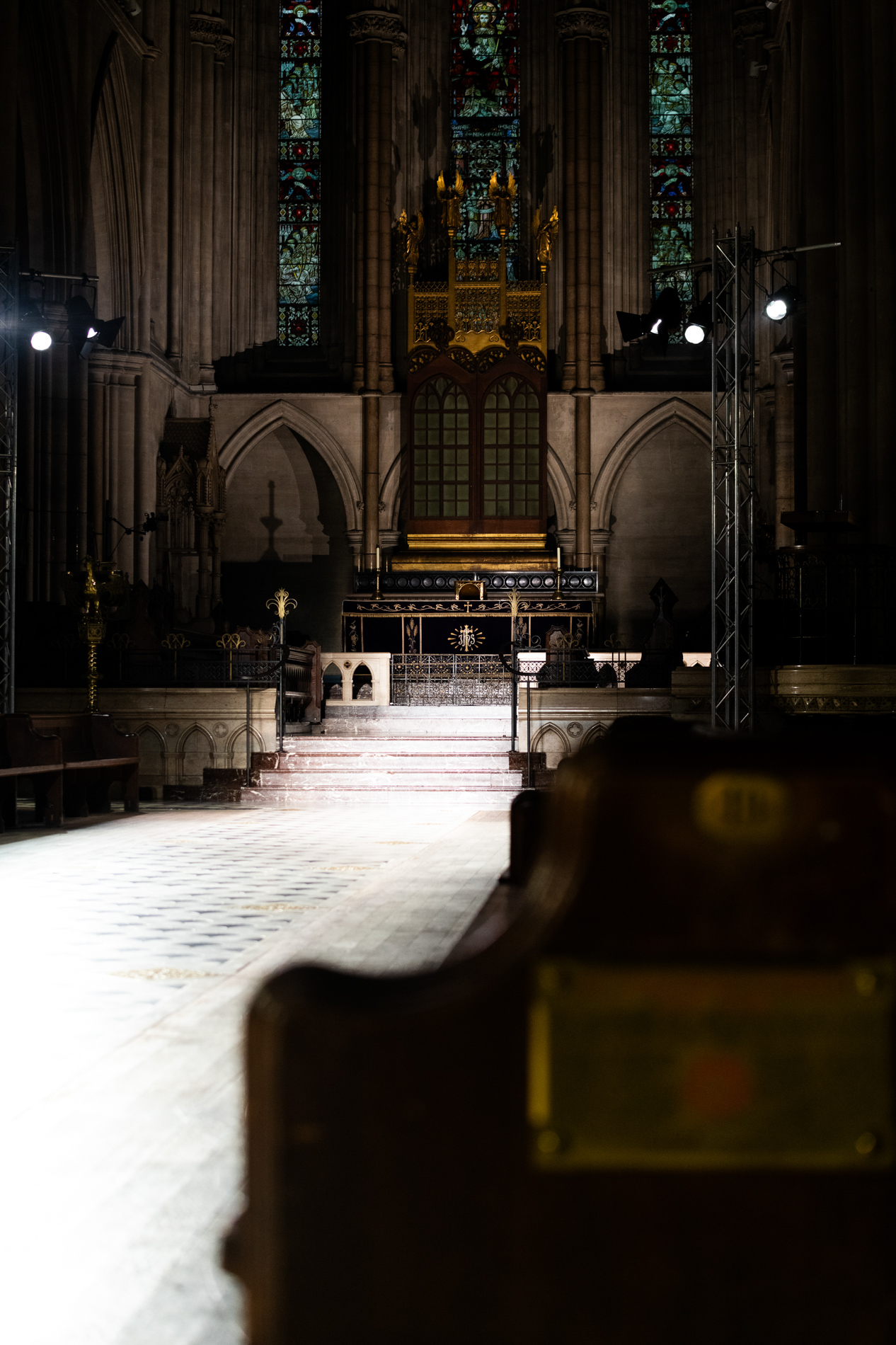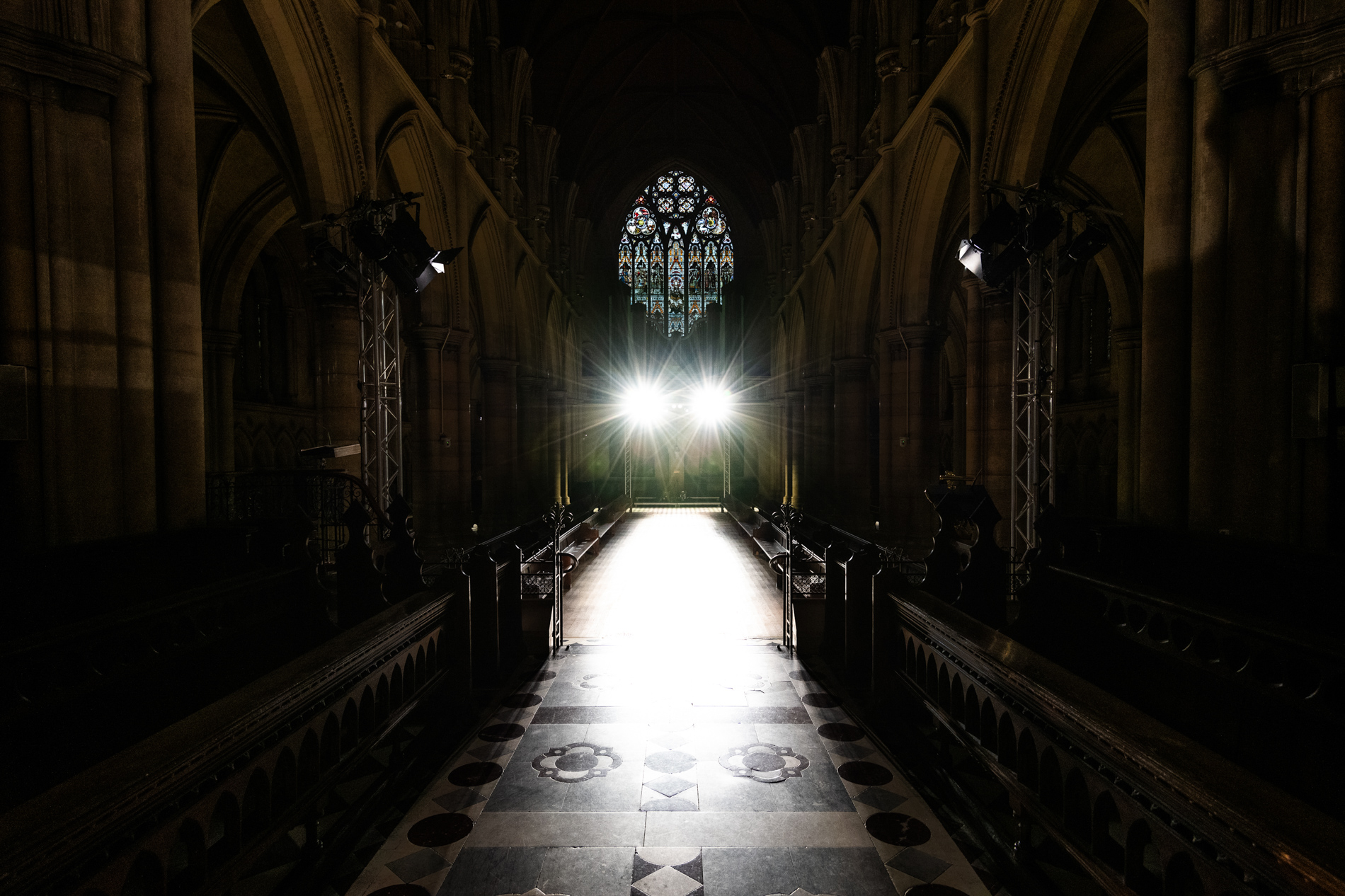 Le parcours s'articulait sur les trois axes de la nef, mis en valeur par un éclairage.