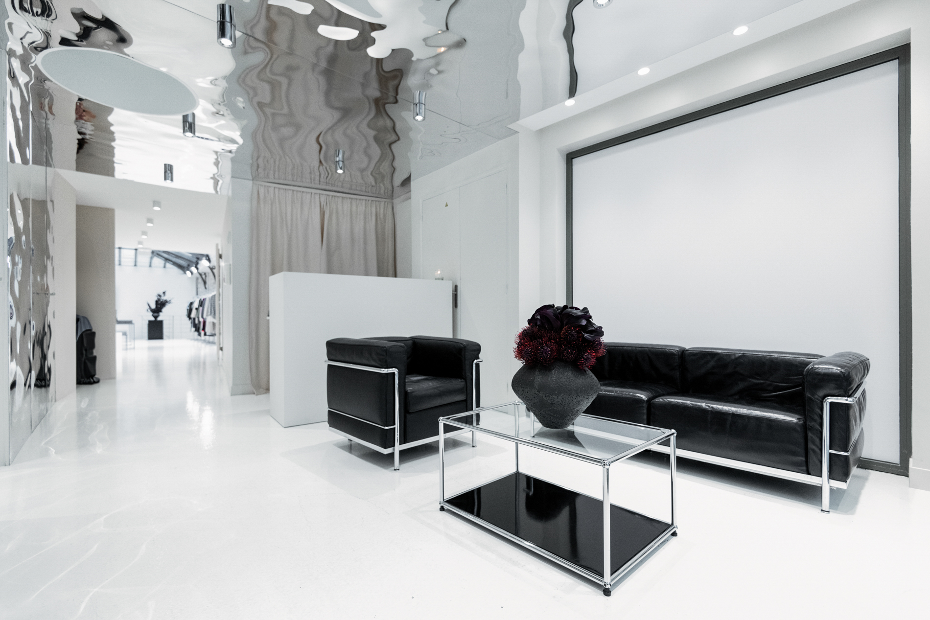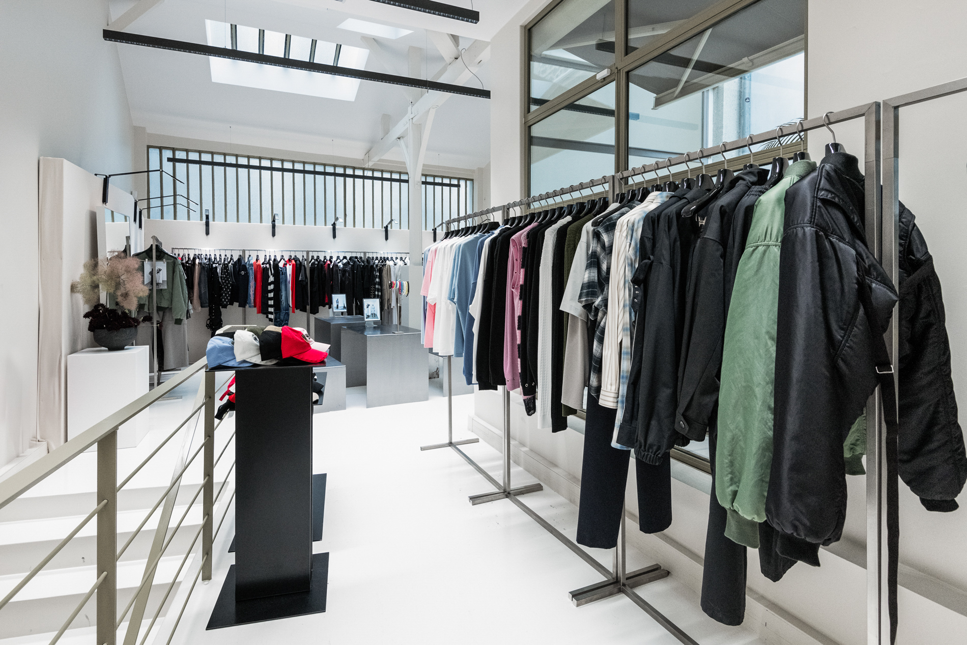 Le showroom de We11done combine des lignes épurées, un mobilier métallique et des teintes lumineuses douces, créant ainsi une esthétique élégante et contrastée.